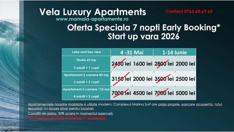Vela Luxury Apartments – apartamente de închiriat pentru cazare în Mamaia Nord – vă promite o experiență de vacanță de neuitat la malul mării.